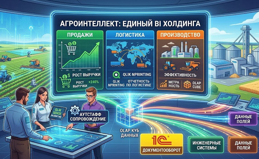В рамках аутстаф‑сопровождения у крупного заказчика были выполнены работы по адаптации и развитию корпоративной аналитики на базе Qlik Sense, NPrinting и OLAP-куба. Проекты охватывали изменения в документообороте 1С, интеграцию данных из инженерных систем и консолидацию отчетности по логистике.