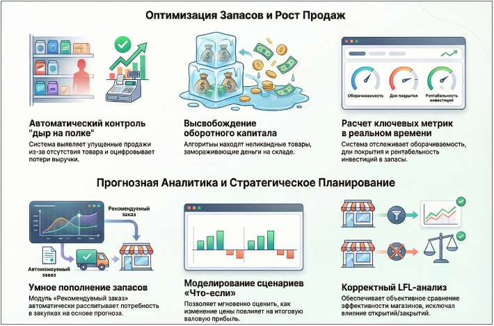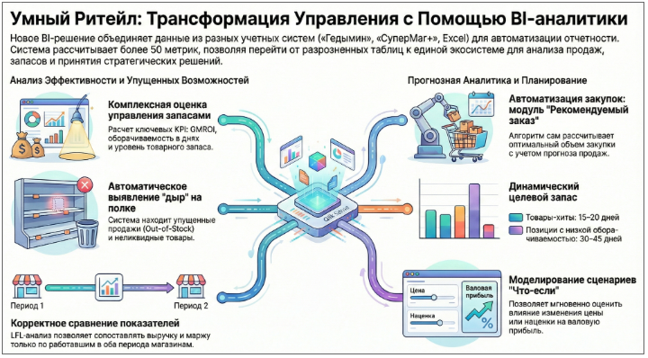 Внедрение данного технологического стека позволило перейти от разрозненных табличных отчетов к единой экосистеме данных, обеспечивающей прозрачность складских операций и высокую точность финансового планирования.