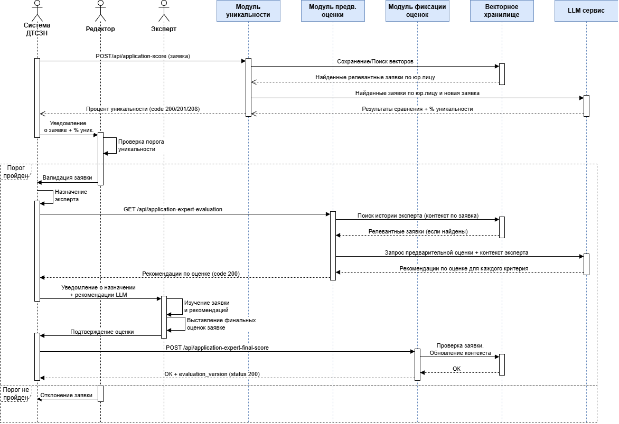 - API-интеграция: REST endpoints (/application-score, /expert-evaluation) для бесшовного подключения к основной системе; фиксация оценок эксперта обновляет персональный контекст LLM.